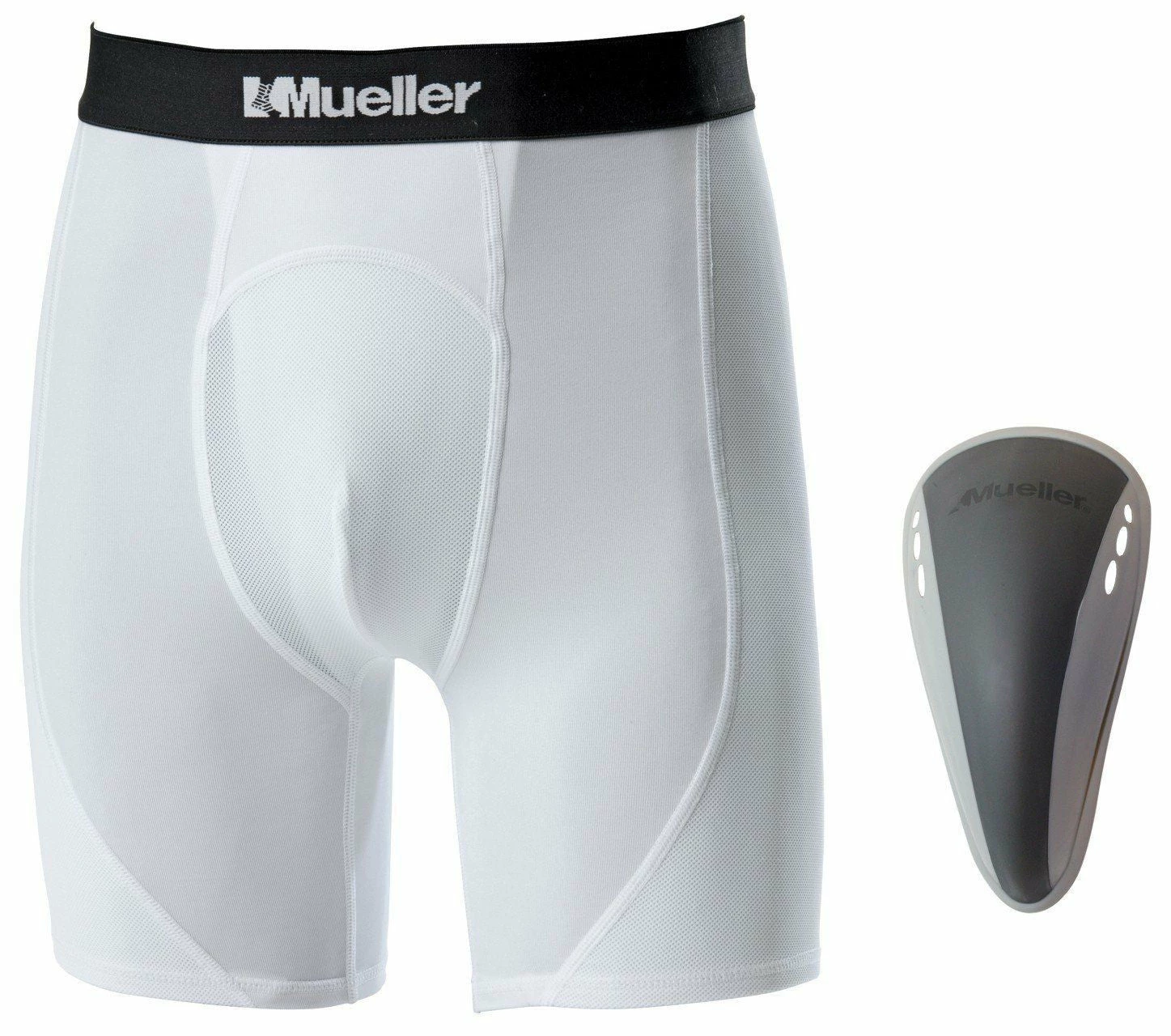 Mueller’s breathable adult support shorts feature a Flex-Shield cup pocket with soft rubber edges and venting.